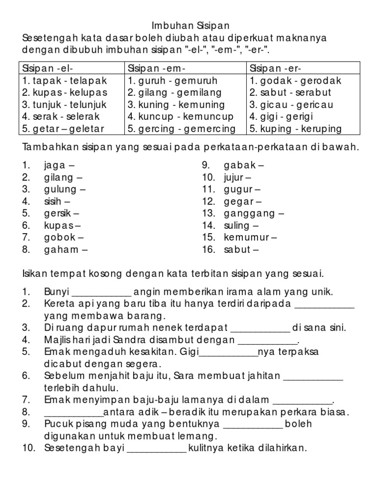 Manakala Nik Safiah hanya menghuraikan awalan kata nama kata kerja dan kata adjektif. Kata Dasar Perkataan yang boleh berdiri sendiri. Imbuhan sisipan merupakan imbuhan istimewa yang dibubuh di tengah kata akar untuk mengubah fungsi ertinya cth.